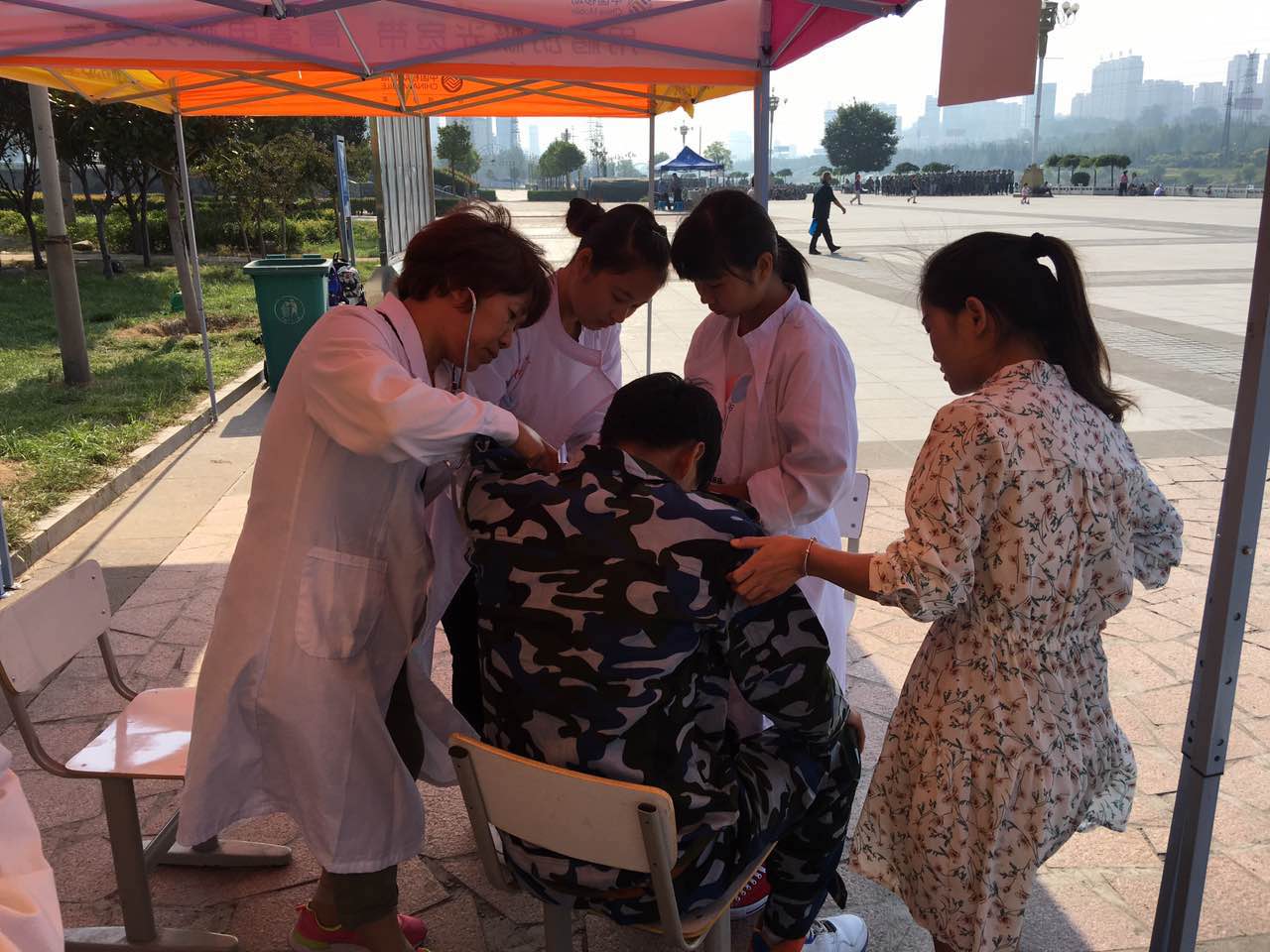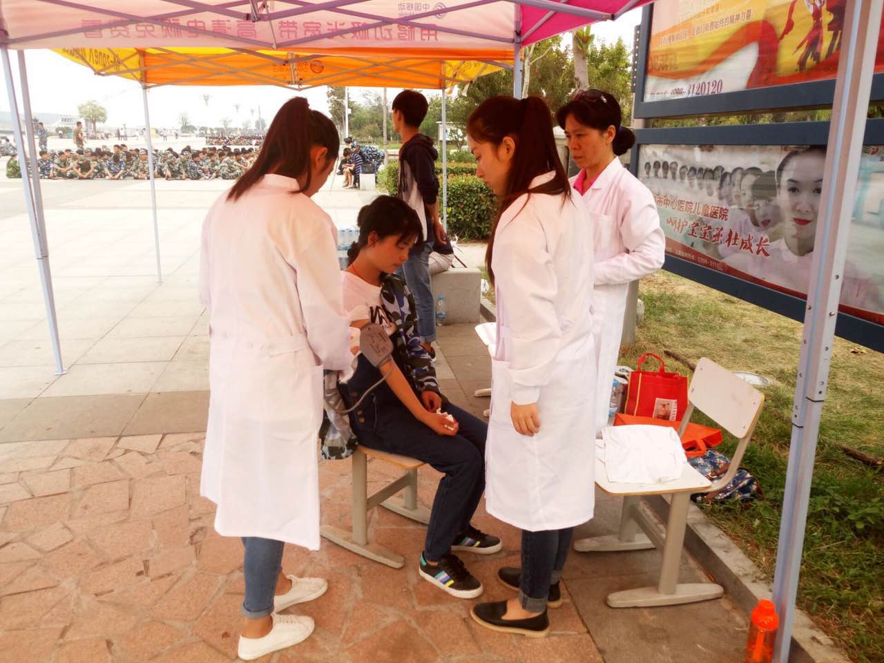 由于天气原因,军训开始不久,一些体质较虚弱的同学就陆续出现了各种不适和晕厥,医护人员及时实施现场急救,认真仔细地诊断病情,迅速救治。“来,把这杯糖水喝了”“快把藿香正气水喝了解解暑”“没关系,休息一下”......端水递药,亲切的语言,和蔼的笑容,安慰和鼓励着同学们。近二十多天以来,她们一直坚守在军训场地上,特别是在中秋节期间,医务人员放弃休假,依然驻守在军训现场,随时为生病的同学们提供及时的现场救治。