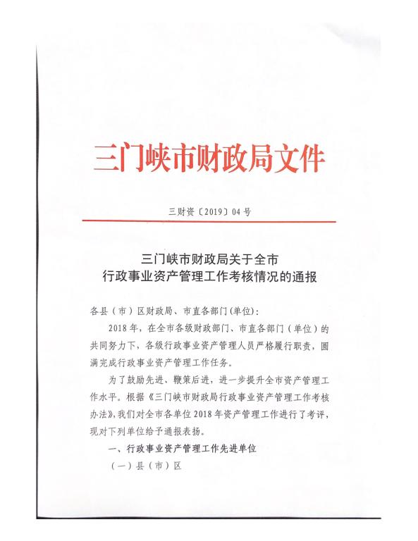 2018年度,学院资产管理工作,在院领导大力支持下,在全院师生的共同努力下,认真开展各项工作。进一步健全管理体制,完善监管措施,强化宣传教育,有力地促进了学院资产管理工作再上新台阶。在全市各级行政事业单位的资产管理工作评优表先中,我院荣获“2018年度资产管理工作先进单位”(三财资[2019]4号)。